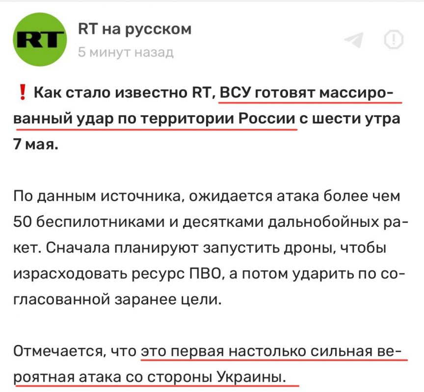Как пишет RT со ссылкой на источник, ВСУ пик массированного удара по территории России придётся на 6 утра 7 мая. Ожидается атака более чем 50 беспилотниками и десятками дальнобойных ракет.