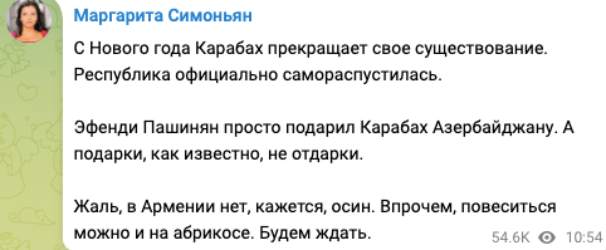 Первой на сообщение откликнулась главный редактор RT Маргарита Симоньян. Он вновь упрекнула президента Армении Никола Пашиняна в предательстве, иронично называя его на тюркский манер «эфенди» (господин).