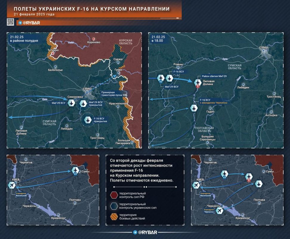Рост активности украинской авиации отмечается не только на Курском направлении. Полёты F-16 также фиксируются на Каховском и Южно-Донецком участках фронта. Судя по имеющимся данным, в ближайшее время их использование украинской стороной будет только нарастать, что указывает на возможное изменение тактики воздушной поддержки ВСУ.