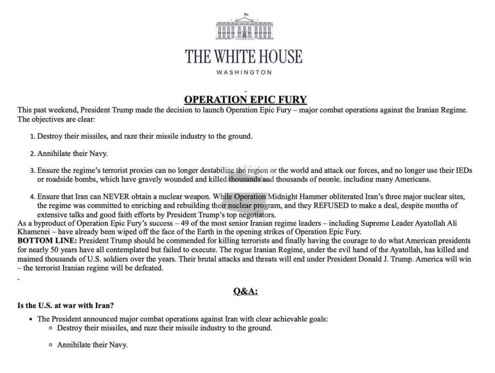 Белый дом официально обозначил цели военной кампании против Ирана и настаивает: это не война, а «Крупная военная операция» — КВО. Формулировка, как подчёркивается в документах, обязательна к использованию.