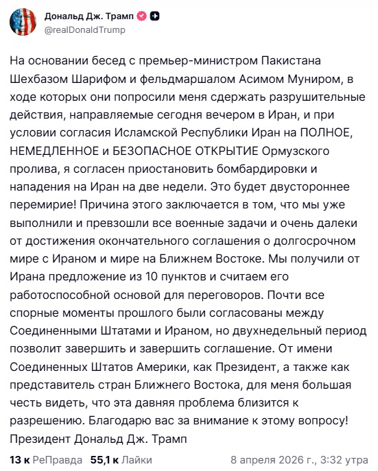 Перелом произошел после того, как Дональд Трамп объявил о договоренности с Тегераном о двухнедельном прекращении огня. По его словам, решение о приостановке ударов было принято при условии немедленного и безопасного открытия Ормузского пролива. Иранская сторона через Высший совет безопасности также подтвердила согласие на перемирие.