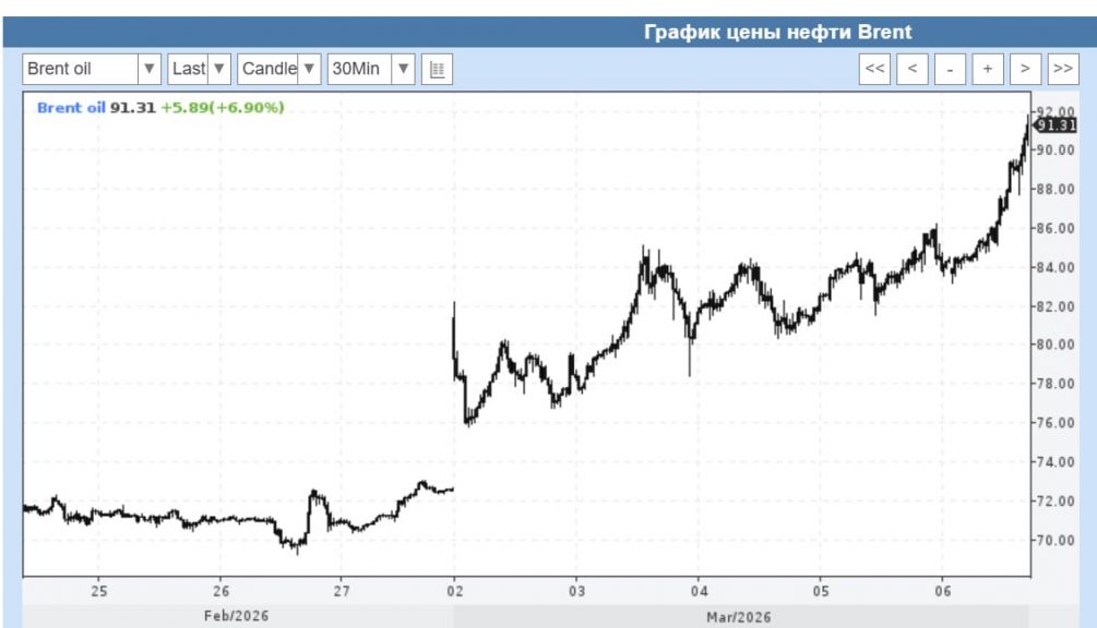 По состоянию на 6 марта 2026 года мировые цены на нефть продолжают уверенный рост. Стоимость барреля Brent впервые с апреля 2024 года превысила отметку в 90 долларов. К 16:51 по московскому времени майские фьючерсы на эту марку подскочили на 5,64% до 90,23 доллара. Апрельские фьючерсы на американскую WTI выросли на 8,13%, достигнув 87,6 доллара за баррель.