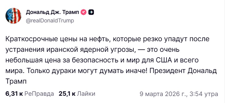 На фоне нефтяного кризиса президент США Дональд Трамп заявил, что резкий рост цен носит краткосрочный характер. Он отметил, что текущее повышение — это «небольшая плата за безопасность США и всего мира» и выразил уверенность, что стоимость барреля довольно быстро снизится после нейтрализации ядерной угрозы со стороны Ирана.