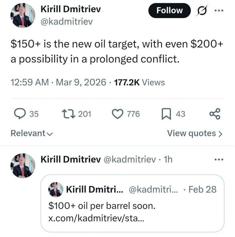 Рост цены на нефть выше 100 долларов прогнозировал спецпредставитель президента РФ, глава РФПИ Кирилл Дмитриев. Он считает, что нефть может дойти до отметки $200 уже совсем скоро.