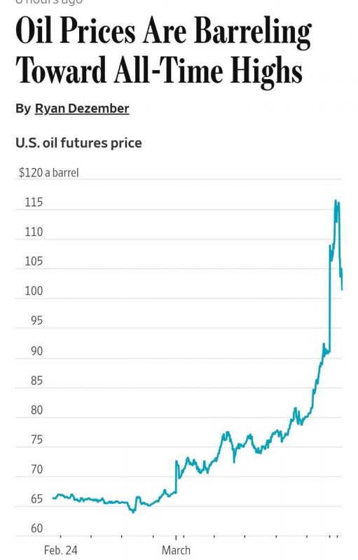 Мировые цены на нефть стремительно растут. По данным The Wall Street Journal, в случае серьёзных геополитических потрясений на Ближнем Востоке стоимость барреля может достигнуть $215 с учётом инфляции — абсолютного исторического максимума.