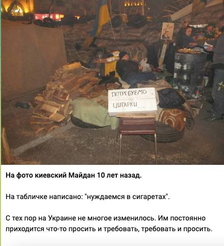 В соцсетях весьма кстати появилось фото 10-летней давности. На нем участники Майдана в Киеве просят обеспечить их сигаретами. За эти годы требования только растут.