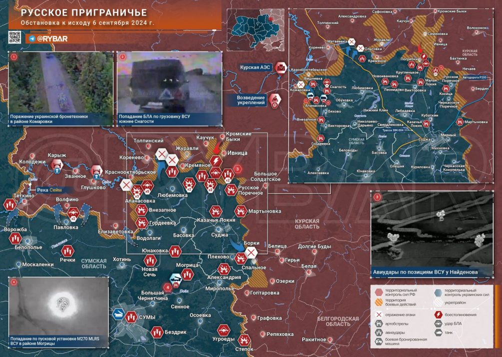 В Суджанском районе отмечены бои в районе Борков, а также уточнена линия фронта на подступах к Камышевке, где оперативно-тактическая авиация ВКС России нанесла авиаудары по позициям ВСУ в лесных массивах. В районе Марьевки продолжаются столкновения, где российские операторы БЛА эффективно поражают технику противника.