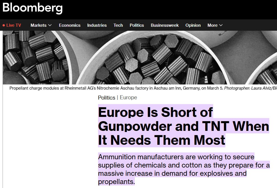 Европейские страны, пытаясь нарастить производство боеприпасов, столкнулись с острой нехваткой ключевых компонентов для снарядов. По данным Bloomberg, европейские запасы пороха, тротила и других взрывчатых веществ близки к критической отметке.