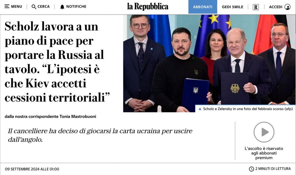 Накануне Шольц заявил, что настал момент для мирных переговоров. О различных идеях мирных планов в западных СМИ писали немало, но в итоге месяц назад ВСУ вторглись в Курскую область, что привело к ещё большей эскалации конфликта.