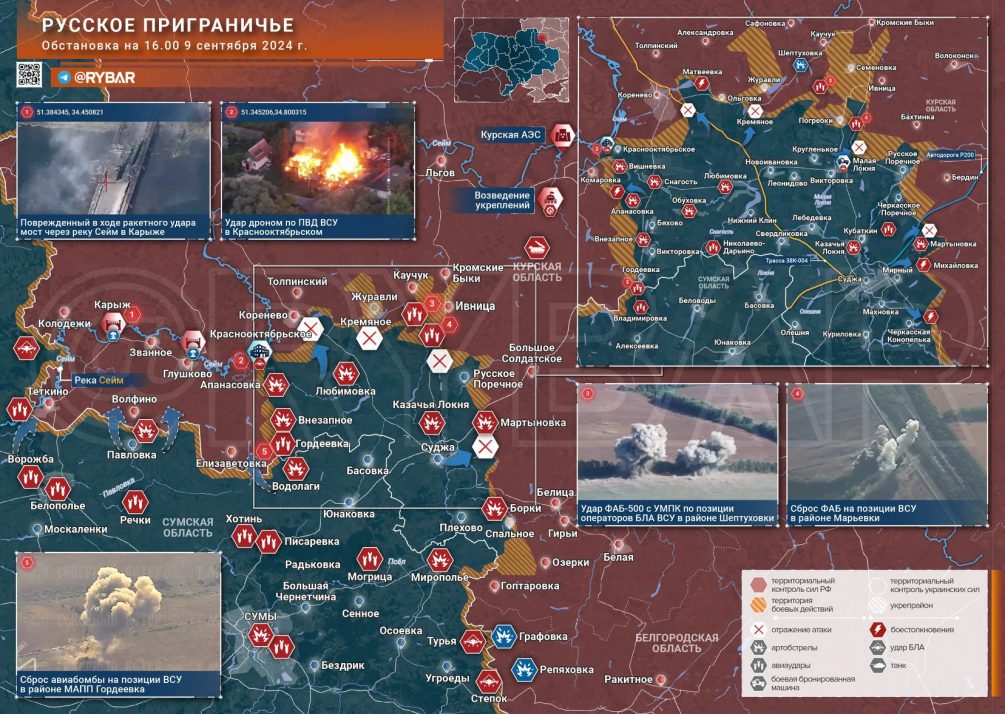 «В Суджанском районе продолжаются боестолкновения в районе Мартыновки, Черкасского Поречного и Малой Локни. Авиабомбы используются нами даже в качестве средств контрбатарейной борьбы», - отмечает он.