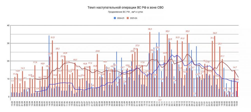 Общий темп наступления в зоне спецоперации с 6 по 9 марта составил более 32 километров.