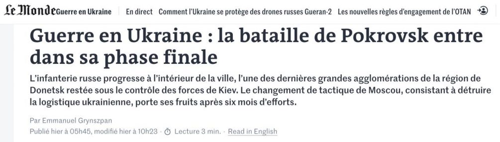Между тем падение Покровска - вопрос дней, максимум двух недель, утверждает французское Le Monde со ссылкой на украинского офицера, воюющего в городе.