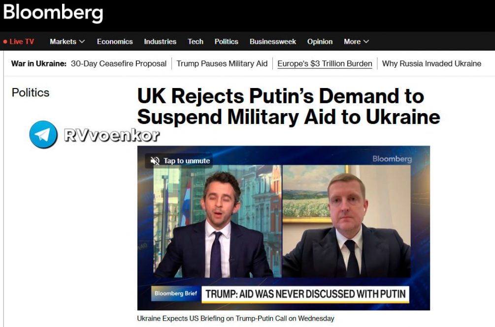 Великобритания категорически отвергла требование президента России Владимира Путина о прекращении поставок вооружения Украине на время возможного перемирия. По информации Bloomberg, британское правительство не намерено менять свою позицию.