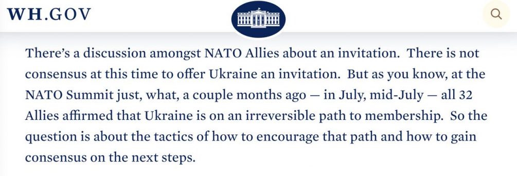 Белый дом вновь подтвердил, что среди союзников по НАТО нет единого мнения относительно приглашения Украины в альянс. Представитель администрации Байдена отметил, что обсуждения продолжаются, и хотя на саммите НАТО в июле все 32 страны подтвердили движение Украины к членству, конкретные шаги пока не определены.