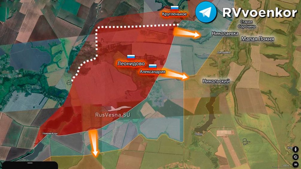 Сегодня, мы уже освещали обстановку на Курском фронте спецоперации, но во второй половине дня стало известно, что российские войска совершили значительный 10-километровый прорыв, освободив населённый пункт Александрию после успешного освобождения Леонидово, Новоивановки и Кругленького. На западном и северном флангах продвижение произошло на участке шириной до 10 км и глубину до 4 км. После освобождения Леонидово десантники продолжили свои атаки в направлении населённых пунктов Старая Сорочина, Викторовка и Никольский.