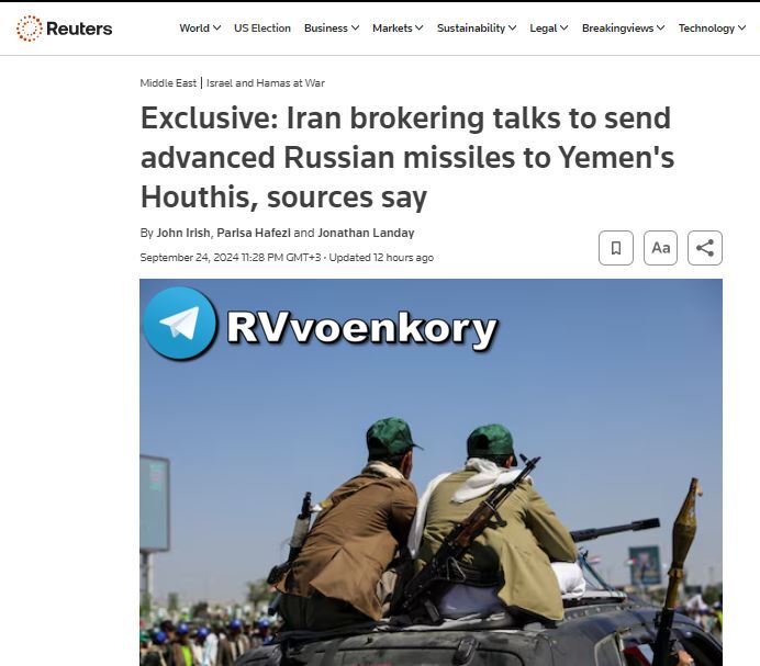 Зарубежное информационное агентство Reuters сообщает, что Россия ведет переговоры с хуситами через Иран о передаче им дальнобойных противокорабельных ракет «Оникс» для уничтожения кораблей Запада.