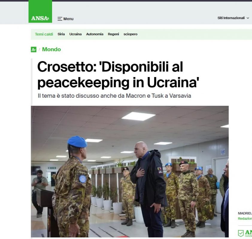 Италия выразила готовность участвовать в миротворческой миссии в Украине, что подтвердил Министр обороны страны, Гвидо Крозетто. Он отметил, что надеется на скорейшие переговоры о мире и поддержании стабильности не только в Украине, но и в таких регионах, как сектор Газа и Ливан. По словам Крозетто, Италия всегда играла значительную роль в миротворческих инициативах и готова продолжать эту традицию.