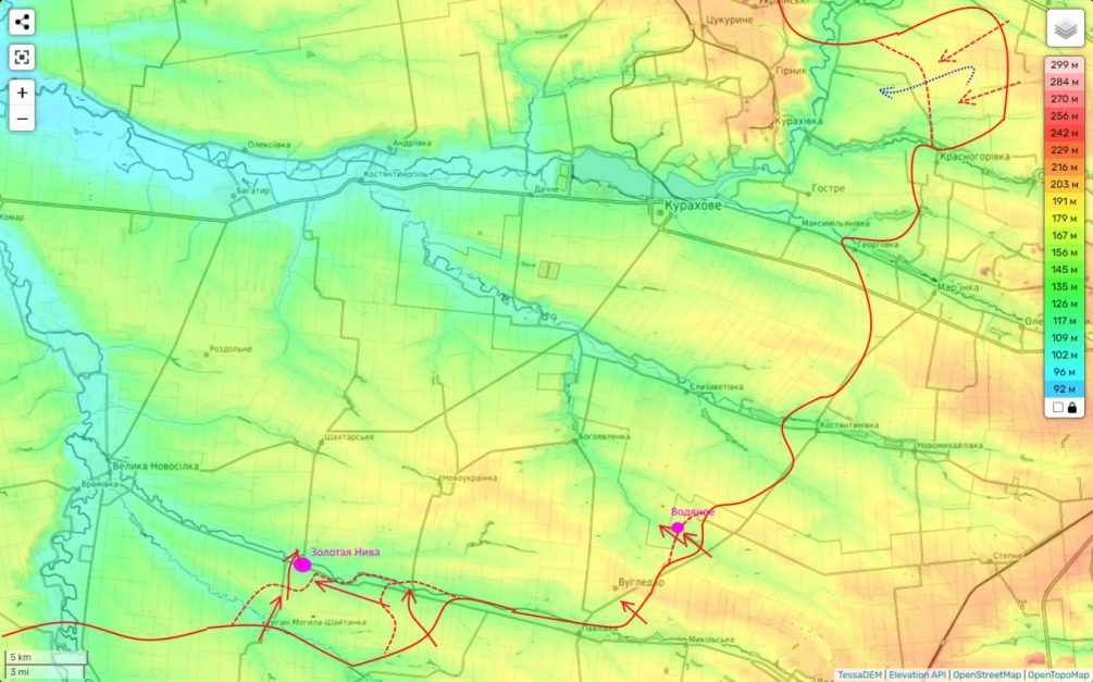Накануне Армия России освободила Пречистовку, прорывая фланг обороны Угледара. Здесь морпехи 40-й бригады и мотострелки полностью выбили армию Украины. Сегодня стало известно, что ВС РФ взяли под контроль н.п. Золотая Нива. Из-за этого Угледар может оказаться в клещах.