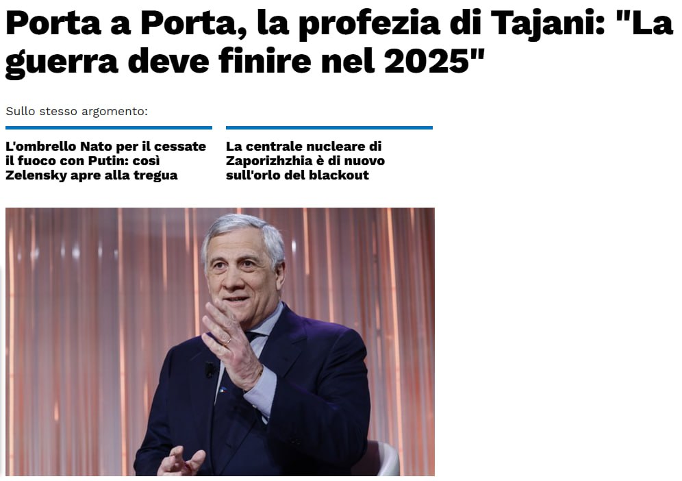 В то же время итальянский министр иностранных дел и вице-премьер Антонио Таяни заявил, что для достижения мира Украине необходимо будет отдать некоторые территории и пойти на уступки России. Он отметил, что если российские войска продолжат продвигаться, Зеленскому придется принимать трудные решения, чтобы избежать ухудшения ситуации. Таяни также указал на необходимость завершения конфликта к 2025 году, что совпадает с ранее высказанным мнением самого Зеленского. Вот только скорее всего Запад и Зеленский видят окончание СВО в разных сценариях.