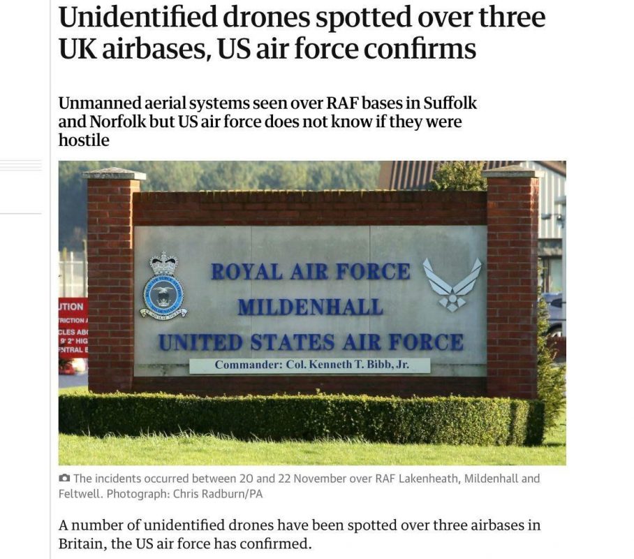 В последние дни над тремя авиабазами ВВС Великобритании наблюдались неопознанные беспилотные летательные аппараты. С 20 по 22 ноября небольшие дроны пролетали над базами Лейкенхит и Милденхолл в графстве Саффолк, а также вблизи базы Фелтуэлл в Норфолке.