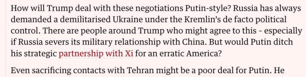 Однако журналисты выражают сомнения в том, что Владимир Путин будет готов отказаться от стратегического партнерства с Си Цзиньпином ради Украины. Даже отказ от отношений с Тегераном может оказаться крайне невыгодным для Российской Федерации и никто не будет разменивать прочные связи ради обещаний из-за океана.