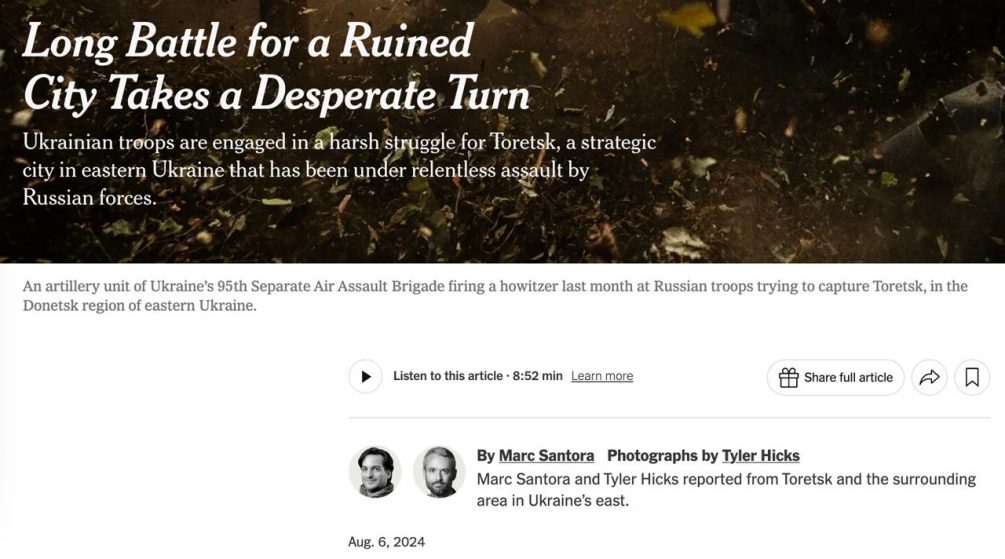 По их данным, очередное продвижение на разных участках составило до 2 км. Утром ряд зарубежных источников со ссылкой на ВСУ сообщили, что украинские войска оставили оборонительный рубеж к востоку от пригорода Торецка - Нью-Йорка.