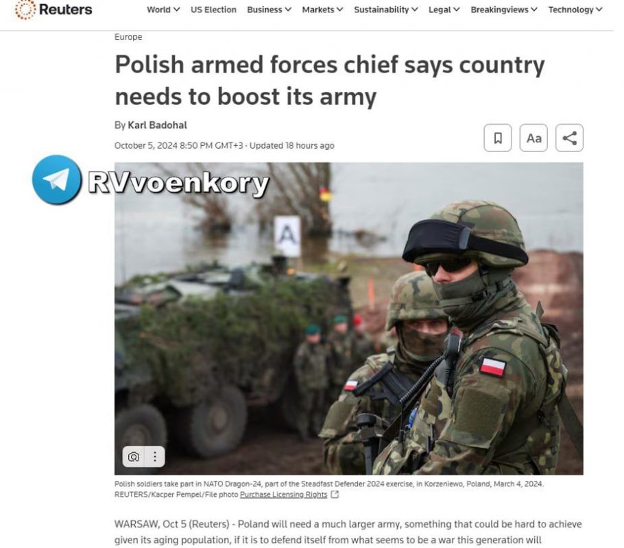 Начальник Генштаба польских войск Веслав Кукула заявил, что демографический кризис может снизить темпы набора в войска, и стране потребуется значительно увеличить численность армии.