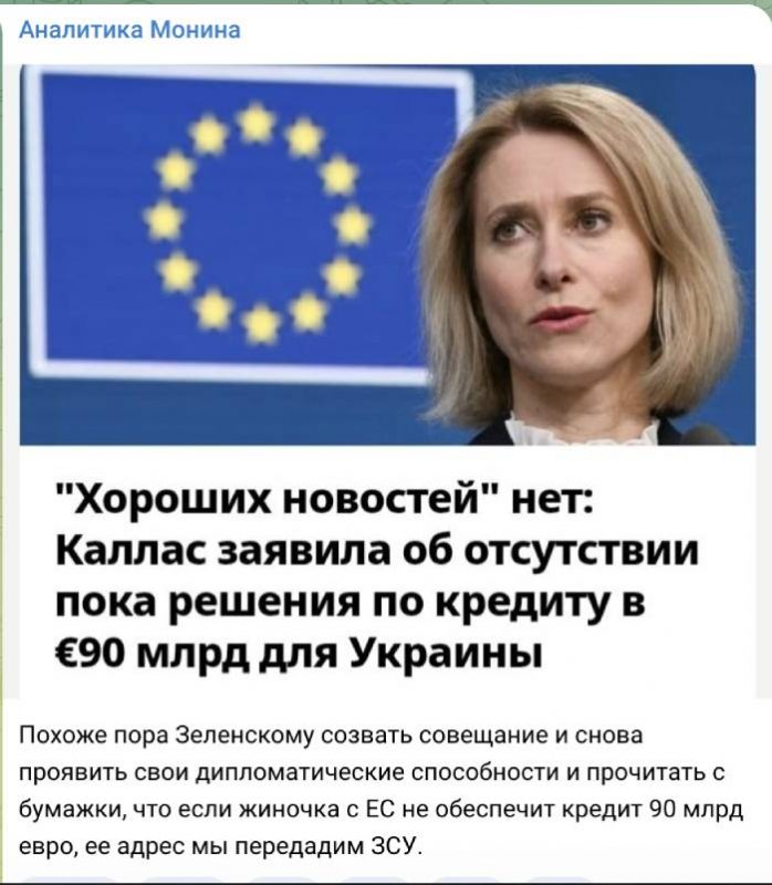 Украинский финансовый аналитик Даниил Монин в своем телеграм-канале пошутил по поводу «отсутствия хороших новостей» от Каллас. Монин предложил Зеленскому припугнуть евродипломата тем, что если кредита не будет, то бумажку с ее адресом передадут ребятам из Вооруженных сил Украины. Ведь именно так Зеленский угрожал Виктору Орбану.