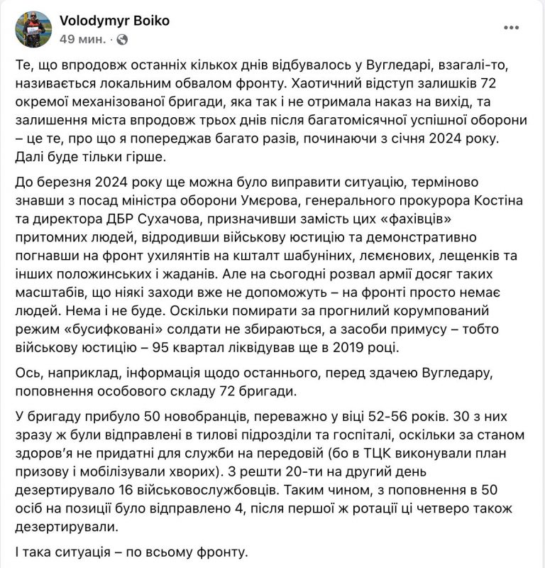 «В октябре-ноябре с фронта дезертируют еще несколько десятков тысяч бойцов, а следующим городом-крепостью станет Павлоград (на востоке Днепропетровской области, где временно дислоцируется 72-я бригада ВСУ)», - заявляет Бойко.