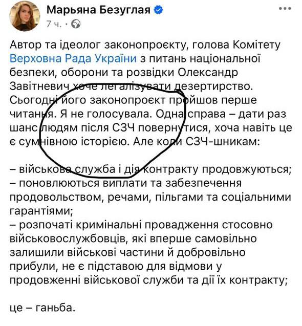 И, кажется, большинство депутатов это и сами понимают, при этом всё равно голосуют. Как депутат рады Марьяна Безуглая. Вроде и отдала свой голос «за», а вот признаваться в этом отказалась. При этом заявив, что законопроект о самовольном оставлении части – это «легализация дезертирства». Популистка делает одно, а говорит совсем другое, явно пытаясь выйти чистой из этого «омута»…
