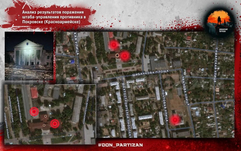 «В районе регулярно наблюдалось скопление офицеров. Внутренняя территория учреждений использовалась исключительно под размещение бронированных автомобилей и автотранспорта. Незадолго до поражения наблюдалось активное движение различных транспортных средств повышенной проходимости, которые один за другим заезжали на внутреннюю территорию объекта — допускается возможность проведения совещания руководящего состава», - пишут местные подпольщики.