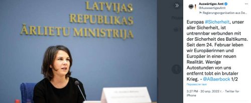 Глава МИД ФРГ Анналена Бербок подтвердила, что федеральное правительство одобрило планы по поставкам бронетехники на Украину, но «у него нет ничего, что можно было бы отправить немедленно». Она подтвердила, что Германия поддержит союзников, отправивших старое оружие, заменив это оборудование.