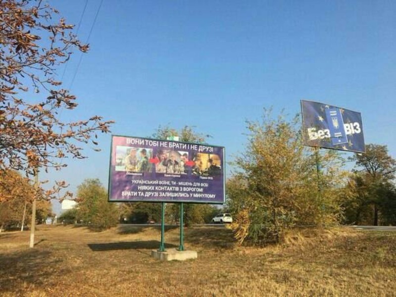 В Херсонской области на границе с Крымом появилась серия билбордов. Эти плакаты-страшилки, по замыслу волонтеров некоей группы, называющей себя «Itchy Trigger Finger Ukrainians», должны остановить украинских граждан и особенно военных от любых контактов с россиянами. В противном случае, станете «мишенью для ФСБ», грозят инициаторы.