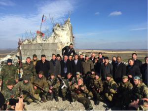 Делегация депутатов Госдумы с воинами Новороссии у разрушенного обелиска
