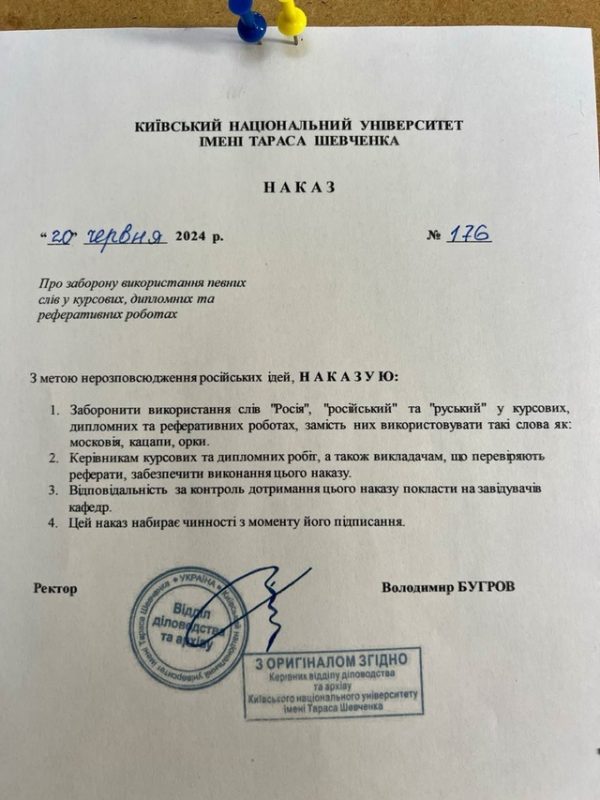 Киевский национальный университет имени Тараса Шевченко запретил студентом в курсовых, дипломных работах и рефератах использовать слова «Россия», «российский» и «русский». Это слало известно после того, как копия приказа за подписью ректора Владимира Бугрова от 20 июня этого года попала в Сеть.
