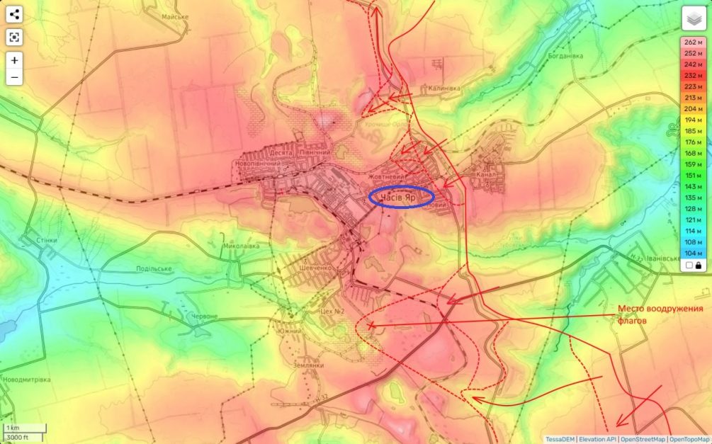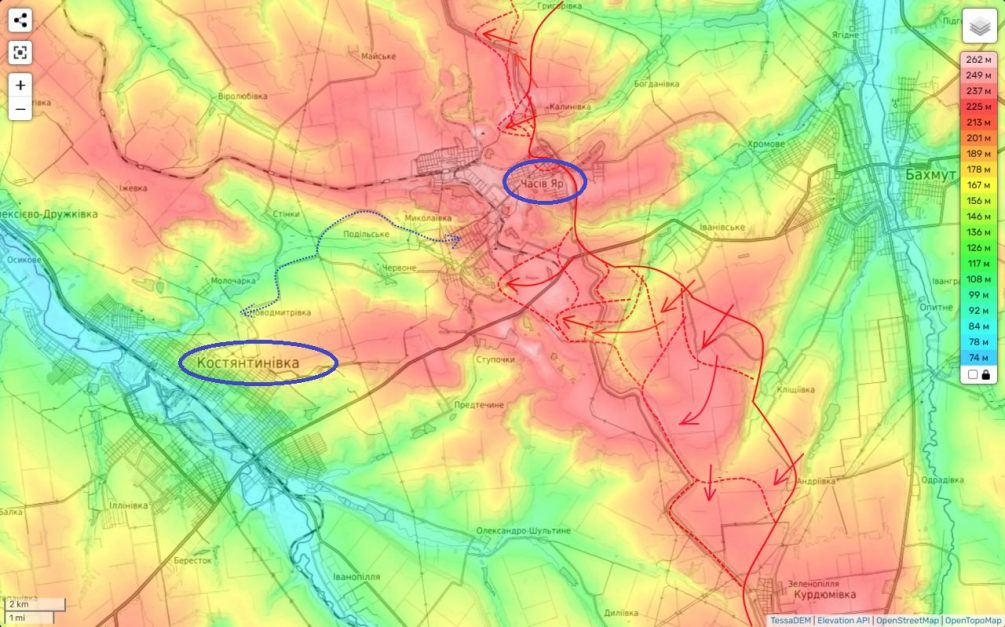 Если взглянуть на карту боевых действий в районе Часова Яра в более широком масштабе, становится очевидно, что наши войска глубоко вклинились в оборону противника. Они преодолели линию главного водораздельного хребта, и дальнейшее продвижение открывает путь к Константиновке. Этот охват позволяет взять под огневой контроль одну из ключевых дорог, ведущих в сам Часов Яр из Константиновки, что создает дополнительные риски для ВСУ.