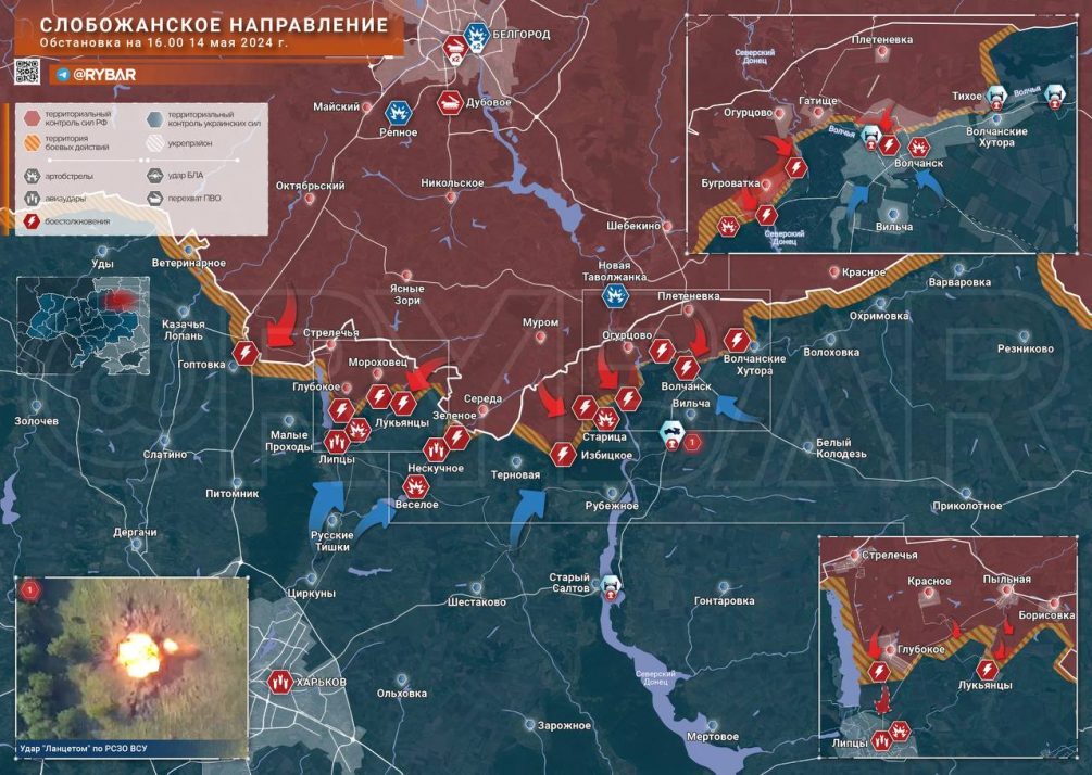 В свою очередь, Минобороны РФ заявляет о захвате села Бугроватка к юго-западу от города. В районах Веселого, Волчанска и Липцов Харьковской области за сутки ВСУ потеряли до 135 военных. «Военная Хроника» публикует карту, на которой виден прогресс наступления на 14 мая.