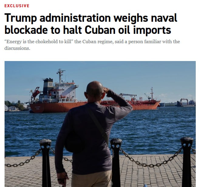 Трамп готовится к полной нефтяной блокаде Кубы. Это станет первым шагом для смены власти на острове, - пишет Politico. Идею предложил Госсекретарь Марко Рубио, чьи родители бежали с Острова в США. Т.е. сценарий отдалённо похож на венесуэльский: блокада, экономический кризис, который приведет к народным волнениям, а потом ограниченная военная «помощь» США со сменой руководства страны.