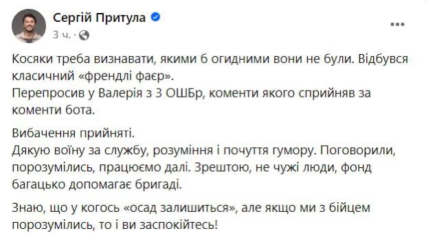 На своей странице в соцсетях Притула грубо ответил на комментарий бойца 3-й штурмовой бригады, созданной из «азовцев», Валерия Жемчужникова.