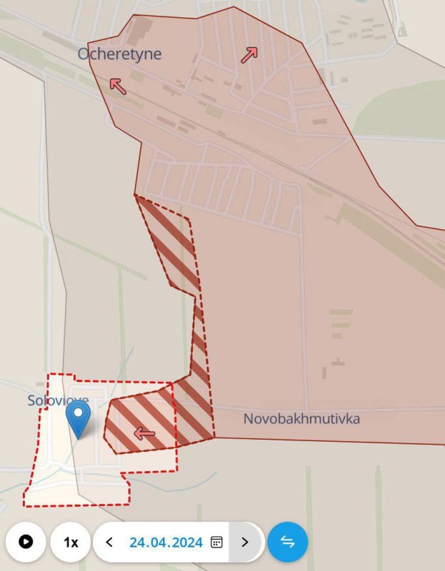 «ВС РФ продвинулся в селе Соловьево к югу от Очеретино. Также продвижение есть между этими населенными пунктами. Новомахмутовка потеряна. Это создаёт угрозу позициям ВСУ в Бердычах, которые рискуют попасть в окружение», - сообщает украинский ресурс DeepState, анализирующий обстановку на фронте СВО.