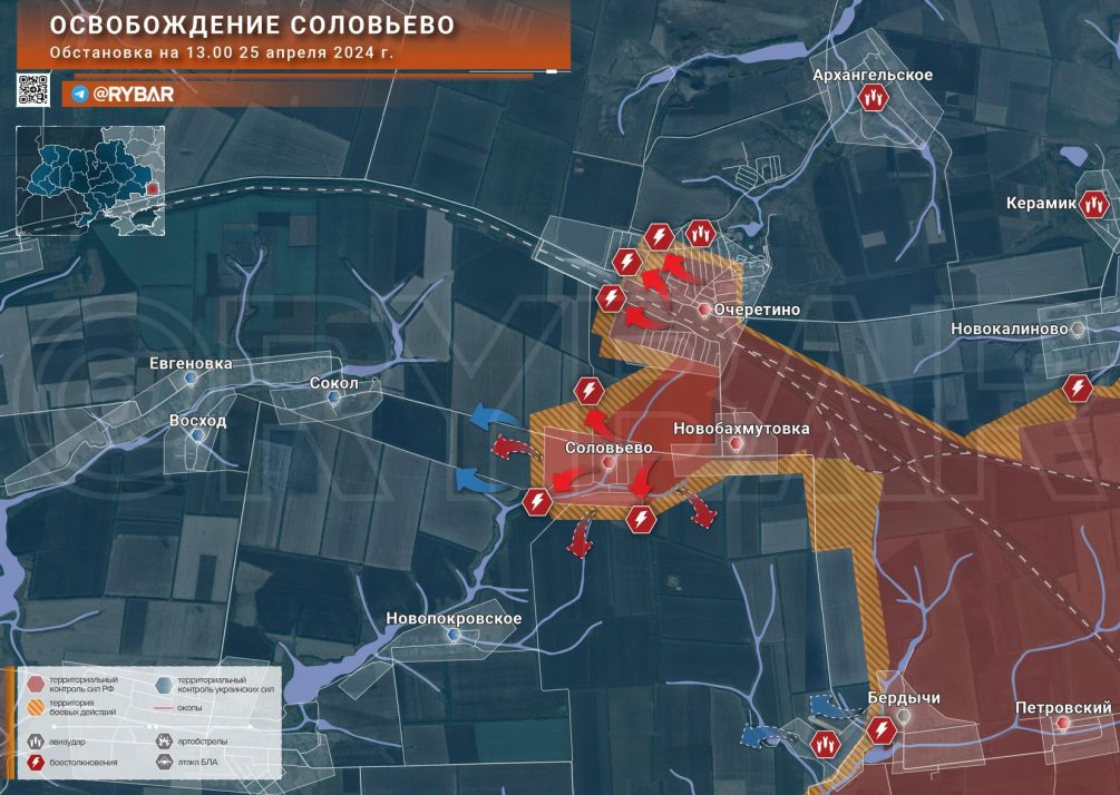 «Практически сразу после успеха в Новобахмутовке подразделения российской армии наскоком освободили село Соловьёво к югу от Очеретино, продвинувшись по дороге от Новобахмутовки. В настоящее время бойцы ВС РФ ведут зачистку позиций, большая часть группировки сбежала в направлении населённого пункта Сокол. Оттуда ВСУ ведут огонь по нашим военнослужащим», - пишет он в Телеграм-канале «Рыбарь».