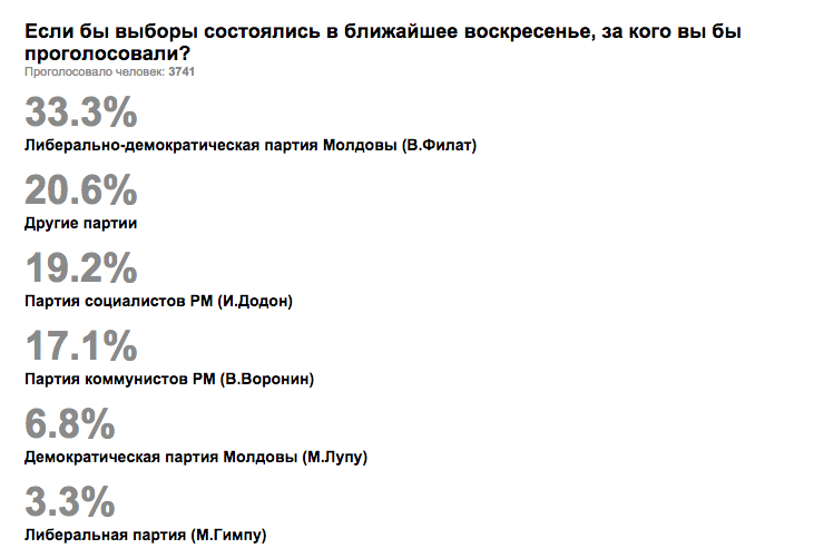Молдавское интернет-издание AVA.md опубликовало опрос, результаты которого показывают высокую популярность в стране оппозиционной Партии социалистов Республики Молдова (лидер - Игорь Додон), набравшей 19,2 процента голосов. Партия обошла по данным интернет-опроса по популярности Партию коммунистов и уступила только Либерально-демократической партии Молдовы, находящейся во главе нынешней правящей коалиции.