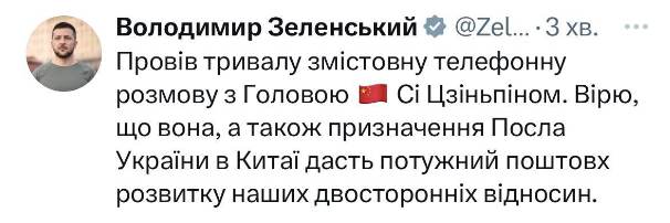 Также Зеленский выразил надежду, что звонок «придаст мощный импульс развитию» двусторонних отношений. Никаких дополнительных подробностей, кроме сообщения президента Украины в соцсетях, не приводилось. В Офисе Зеленского только уточнили, что «долгий и содержательный» разговор длился час. Это первый прямой разговор Си Цзиньпина с Владимиром Зеленским после начала специальной военной операции России.