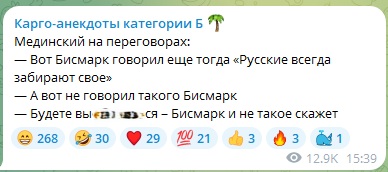 Сам Мединский после переговоров вспомнил, что он историк. Процитировал Наполеона Бонапарта («Война и переговоры ведутся одновременно») и Отто фон Бисмарка («Русские всегда приходят за своим»). Любопытно, что эти цитаты – так называемые апокрифы. То есть их приписывают двум данным историческим деятелям, однако никаких документальных подтверждений, что они писали или говорили подобное, нет.