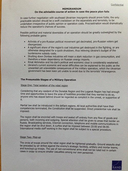 Документ предположительно подготовлен специалистами американского стратегического исследовательского центра RAND Corporation. В нем содержится алгоритм действий карательных сил на востоке Украины, сообщает канал RT.