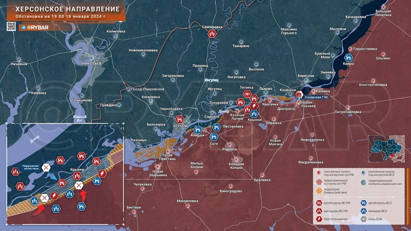 «На Херсонском направлении стабильно-напряжённой остаётся ситуация в районе села Крынки. Несмотря на появившиеся 17 января сообщения о водружении российского флага в селе, до возврата посёлка под российский контроль ещё далеко», - сообщает военный эксперт Борис Рожин.