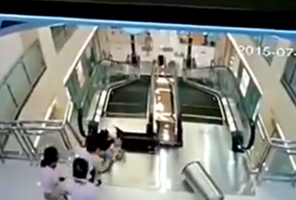 30-летняя китаянка со своим сыном поднималась по эскалатору. Они доехали до верха, женщина взяла малыша на руки, и внезапно пол под ними провалился. За секунду до смерти она успела подать сына сотрудникам торгового центра. Тут же эскалатор затянул ее внутрь механизма.