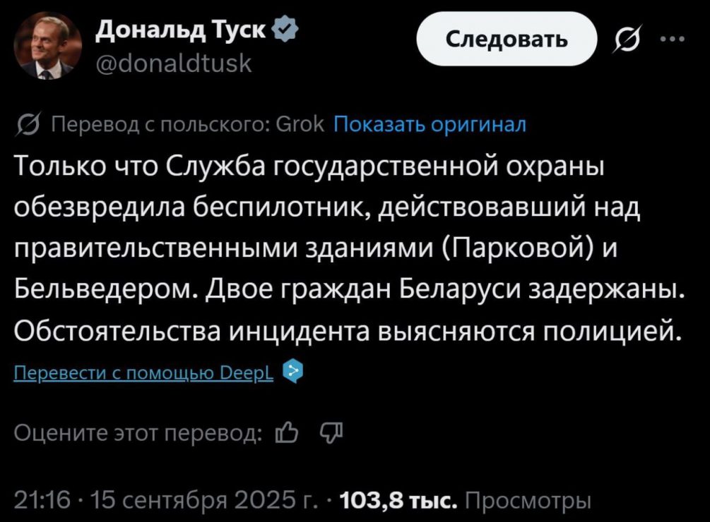 Тем не менее история продолжает раскручиваться. Теперь премьер-министр, русофоб Дональд Туск сообщил о «новой атаке дрона» в Варшаве. По его словам, беспилотник нейтрализовали прямо над правительственными зданиями — Парковой и Бельведером. Кроме того, задержаны двое граждан Белоруссии, которых уже обвиняют в причастности к инциденту.