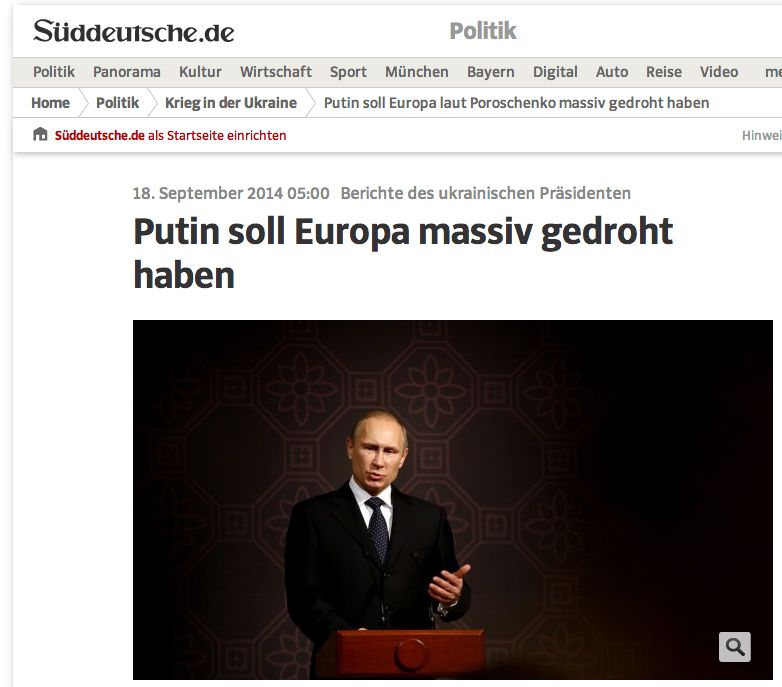 Немецкое издание «Зюддойче цайтунг» (Sueddeutsche Zeitung) написало, что, по словам президента Украины Петра Порошенко, президент России Владимир Путин с разговоре с ним рассказал о возможности армии РФ в два дня занять столицы нескольких государств ЕС.