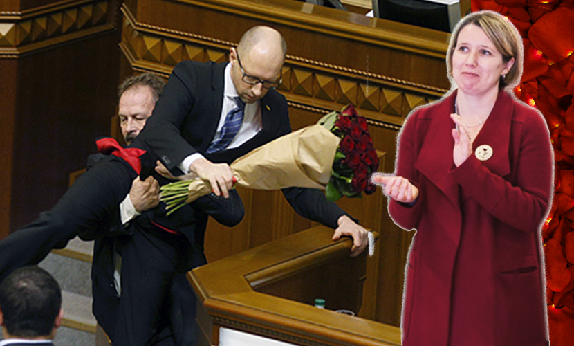 Напомним, утром 11 декабря в Верховной раде обсуждалась возможная отставка Арсения Яценюка с поста премьер-министра, когда к нему внезапно подошел депутат Олег Барна, вручил букет роз и, схватив между ног, попытался унести в никуда. Глава парламента с каменным лицом вцепился в бортики трибуны, при этом почему-то не выпуская из рук цветы.